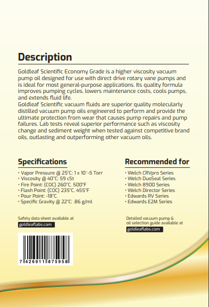 Shopping Cart (0) Quotes (0) Express Ordering All Categories > Vacuum Parts and Accessories > Oil/Grease > Item # 3050 All CategoriesAll Categories Vacuum Parts and AccessoriesVacuum Parts and Accessories Oil/GreaseOil/Grease Item # 3050 Item # 3050, 5 Gallon (gal) Volume Vacuum Pump Oil 30505 Gallon (gal) Volume Vacuum Pump Oil Request Information Email This Page Download PDF Download PDF Printable Page List Price $150.00 Qty. Add To Cart Request Quote /Asset/1-qt-econ-grade.png /Asset/1-qt-econ-grade.png Close Window Vacuum Pump Oil. Used for HVAC, scientific, and general vacuum pumps that require oil. From use in labs to air conditioners, and freeze dryers. Unit of Measure Imperial Metric Both Technical Specs Volume N/A 5 gal Harmonized System (HS) Code N/A 27101990